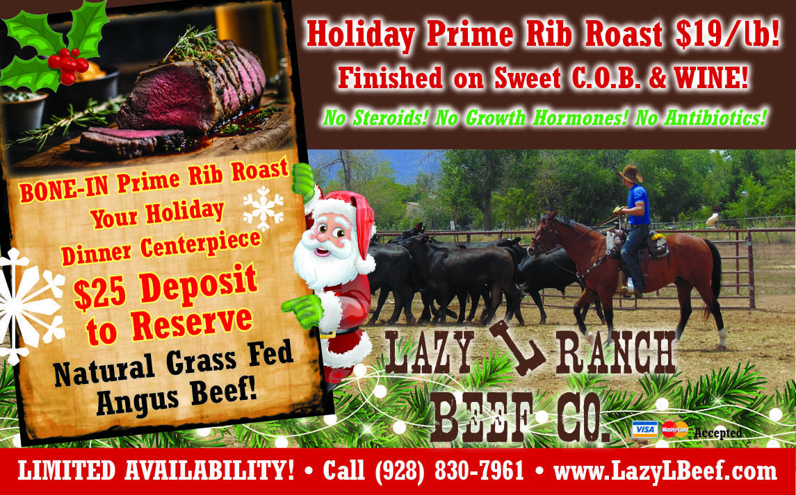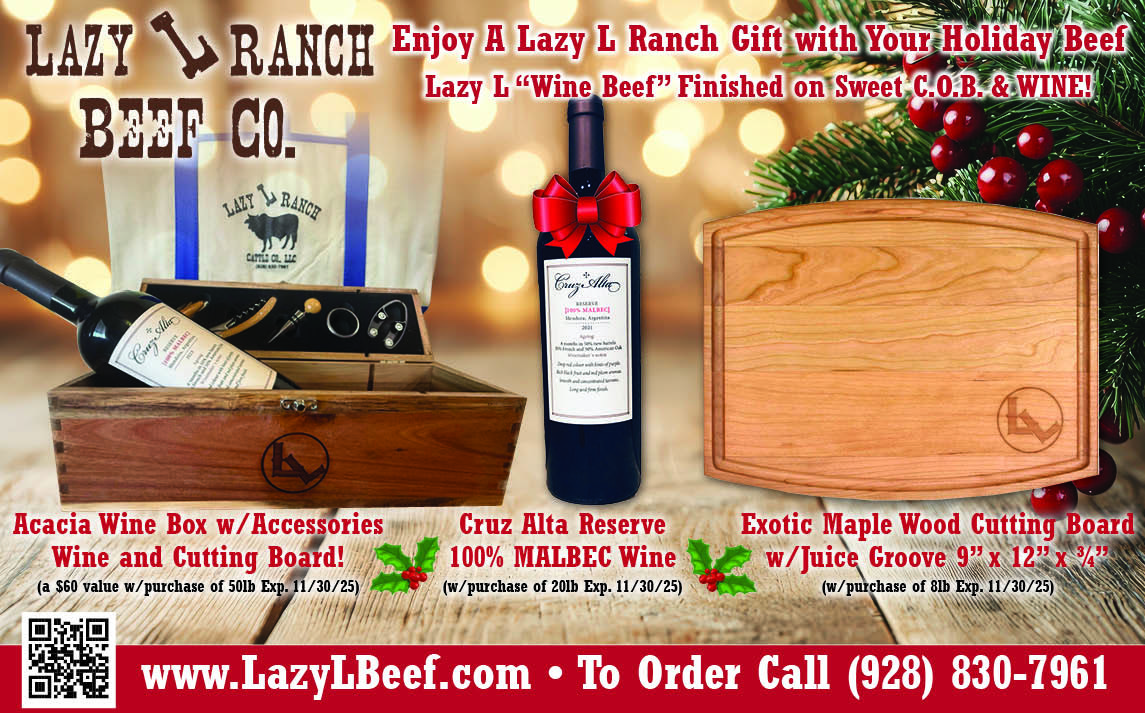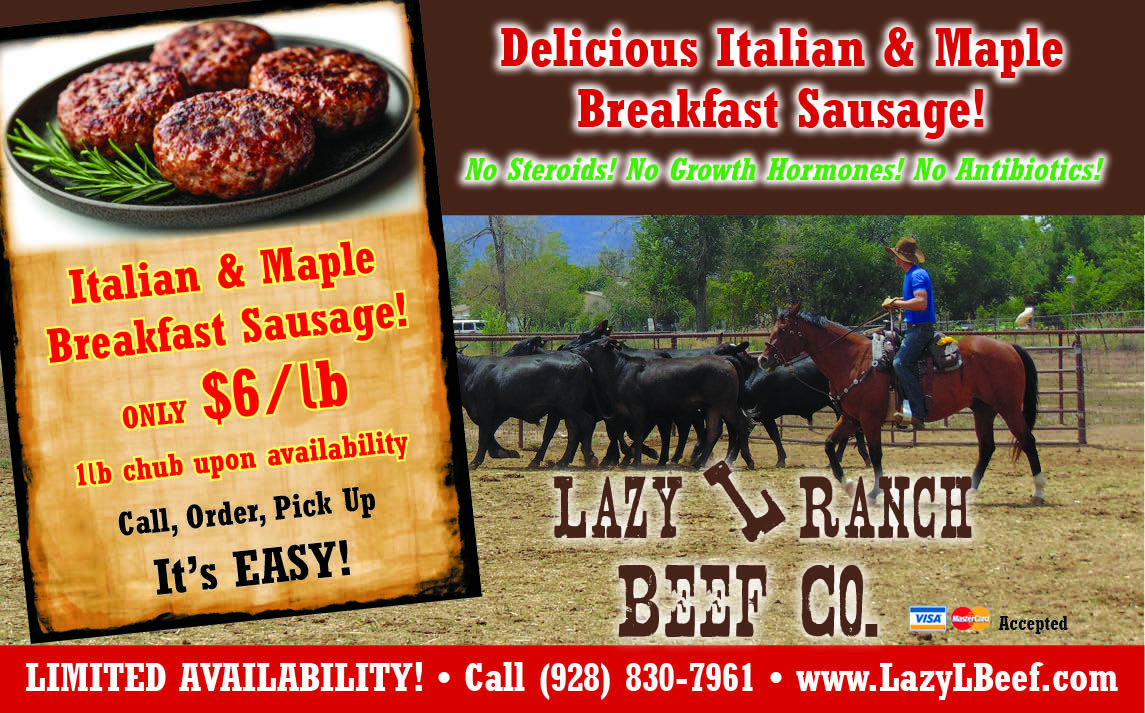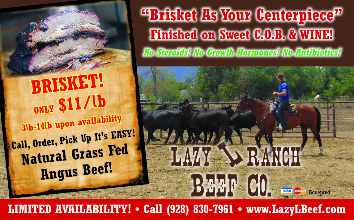 Located in Chino Valley, Arizona, Lazy L Ranch is a producer of the finest quality grass fed Black Angus Beef. Our cattle are pasture raised and finished on Sweet C.O.B and Red Wine. This adds a sweetness, flavor, and marbling you must experience for yourself. We Dry Age our beef 14-21 days for Tender Cuts of beef. Locally raised, processed, and packaged. Lazy L Ranch has become known as the "Best Tasting Beef You've Ever Had" ~ Aaron Lass.