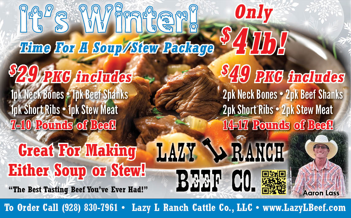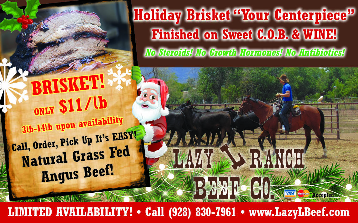 Located in Chino Valley, Arizona, Lazy L Ranch is a producer of the finest quality grass fed Black Angus Beef. Our cattle are pasture raised and finished on Sweet C.O.B and Red Wine. This adds a sweetness, flavor, and marbling you must experience for yourself. We Dry Age our beef 14-21 days for Tender Cuts of beef. Locally raised, processed, and packaged. Lazy L Ranch has become known as the "Best Tasting Beef You've Ever Had" ~ Aaron Lass.